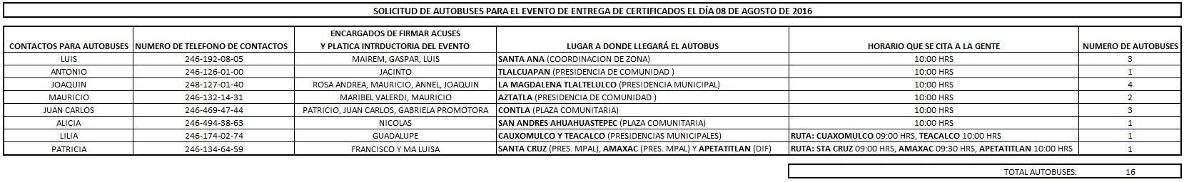 SE LES INFORMA A TODO EL PERSONAL INVOLUCRADO EN LA REALIZACIÓN DEL EVENTO MASIVO DE ENTREGA DE CERTIFICADOS LA LOGISTICA DE TRASLADO EN MINI-BUSES DE LAS DISTINTAS MICRO REGIONES A LA SEDE OFICIAL DEL EVENTO.